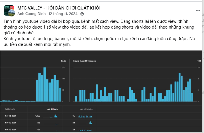 Tình hình youtube video dài bị bóp quá, kênh mất sạch view. Đăng shorts lại lên được view, thỉnh thoảng có kéo được 1 số view cho video dài, ae kết hợp đăng shorts và video dài theo những khung giờ cố định nhé.