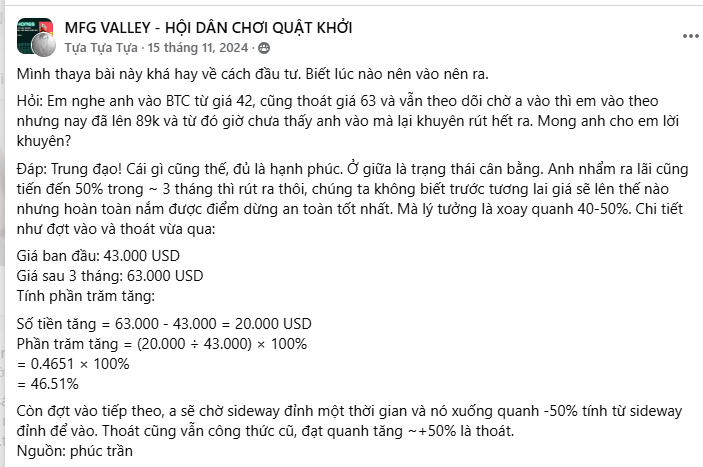 Đáp: Trung đạo! Cái gì cũng thế, đủ là hạnh phúc. Ở giữa là trạng thái cân bằng. Anh nhẩm ra lãi cũng tiến đến 50% trong ~ 3 tháng thì rút ra thôi, chúng ta không biết trước tương lai giá sẽ lên thế nào nhưng hoàn toàn nắm được điểm dừng an toàn tốt nhất. Mà lý tưởng là xoay quanh 40-50%. Chi tiết như đợt vào và thoát vừa qua:
