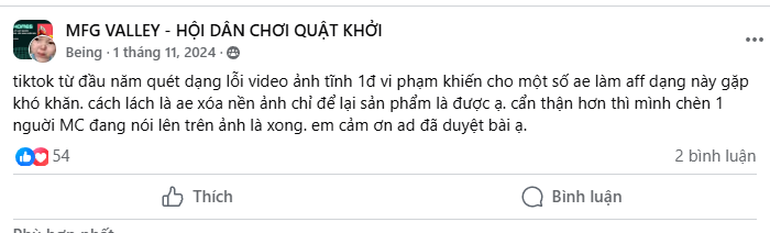 tiktok từ đầu năm quét dạng lỗi video ảnh tĩnh 1đ vi phạm khiến cho một số ae làm aff dạng này gặp khó khăn. cách lách là ae xóa nền ảnh chỉ để lại sản phẩm là được ạ. cẩn thận hơn thì mình chèn 1 nguời MC đang nói lên trên ảnh là xong. em cảm ơn ad đã duyệt bài ạ.