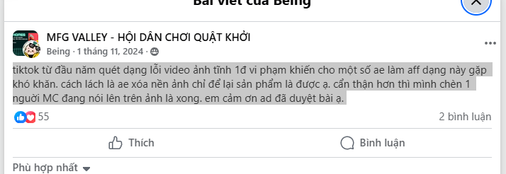 tiktok từ đầu năm quét dạng lỗi video ảnh tĩnh 1đ vi phạm khiến cho một số ae làm aff dạng này gặp khó khăn. cách lách là ae xóa nền ảnh chỉ để lại sản phẩm là được ạ. cẩn thận hơn thì mình chèn 1 nguời MC đang nói lên trên ảnh là xong. em cảm ơn ad đã duyệt bài ạ.