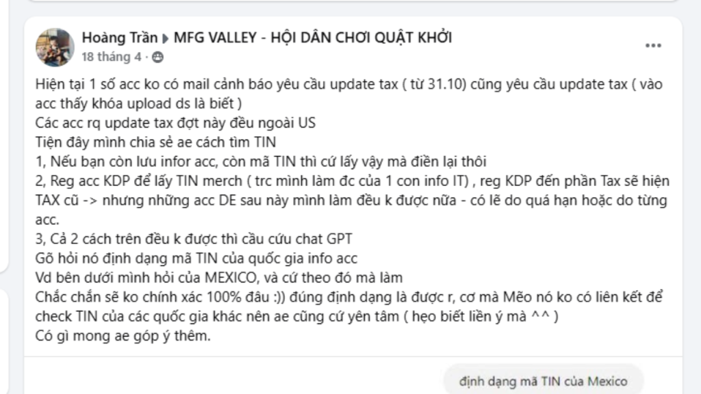 2, Reg acc KDP để lấy TIN merch ( trc mình làm đc của 1 con info IT) , reg KDP đến phần Tax sẽ hiện TAX cũ -> nhưng những acc DE sau này mình làm đều k được nữa – có lẽ do quá hạn hoặc do từng acc.