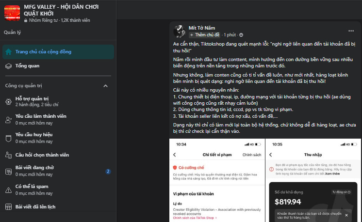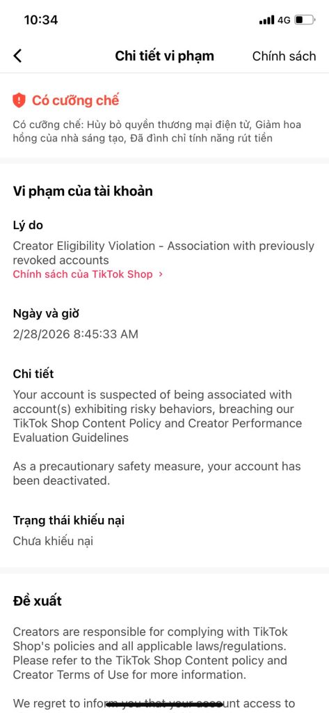 Ae cẩn thận, Tiktokshop đang quét mạnh lỗi: “nghi ngờ liên quan đến tài khoản đã bị thu hồi!”