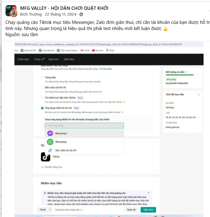 Chạy quảng cáo Tiktok mục tiêu Messenger, Zalo đơn giản thui, chỉ cần tài khoản của bạn được hỗ trợ tính này. Nhưng quan trọng là hiệu quả thì phải test nhiều mới kết luận được