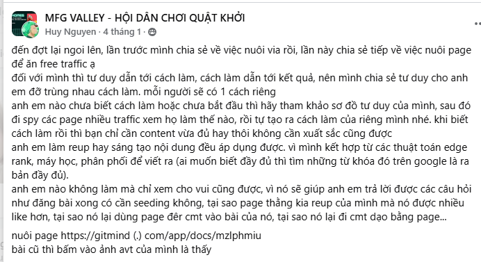 đến đợt lại ngoi lên, lần trước mình chia sẻ về việc nuôi via rồi, lần này chia sẻ tiếp về việc nuôi page để ăn free traffic ạ