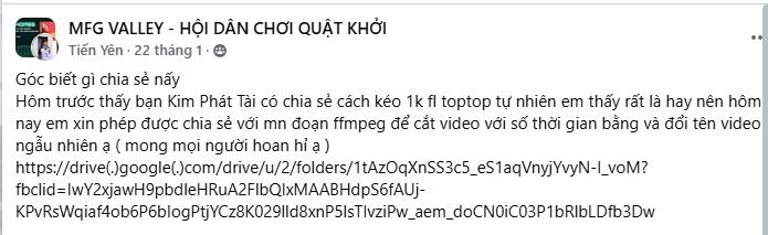 Hôm trước thấy bạn Kim Phát Tài có chia sẻ cách kéo 1k fl toptop tự nhiên em thấy rất là hay nên hôm nay em xin phép được chia sẻ với mn đoạn ffmpeg để cắt video với số thời gian bằng và đổi tên video ngẫu nhiên ạ ( mong mọi người hoan hỉ ạ )