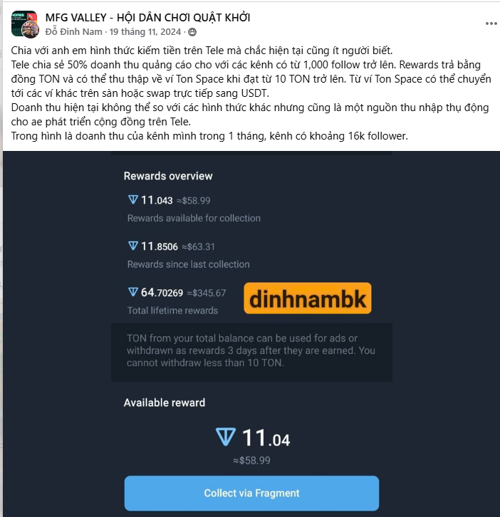 Doanh thu hiện tại không thể so với các hình thức khác nhưng cũng là một nguồn thu nhập thụ động cho ae phát triển cộng đồng trên Tele.