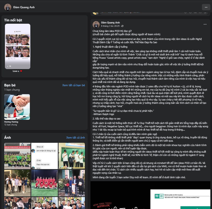 4 tháng đầu tiên vào ngành POD mình bán được 2 sales đều cho trẻ tự kỉ Autism =))), có lẽ là, trong những năm tháng nghèo nàn nhất thì những em bé, mẹ của họ đã ủng hộ mình 2 cái áo màu sắc loè loẹt z, và đó cũng là thời điểm mình căng thẳng nhất. Quá lâu và quá chậm để bứt phá, mình quyết định đi học hỏi mn trong công ty, hỏi từng người về cách họ lên ideas và mãi sau này khi đọc được cuốn sách, mình mới hiểu gốc rễ của việc sáng tạo hiệu quả là như vậy. Sự sao chép y hệt đối phương là vô học, nhưng sự chắp cánh, học hỏi, chuyển hoá các ý tưởng thành công cùng bản sắc tính cách cá nhân sẽ tạo nên ý tưởng sáng tạo “viral”