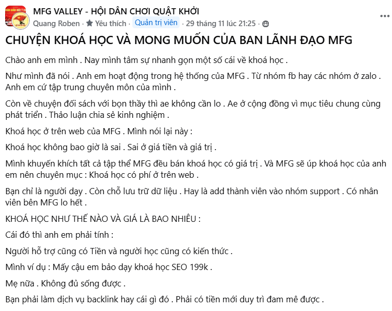 Mình khuyến khích tất cả tập thể MFG đều bán khoá học có giá trị . Và MFG sẽ úp khoá học của anh em nên chuyên mục : Khoá học có phí ở trên web .
