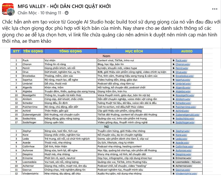 Chắc hẳn anh em tạo voice từ Google AI Studio hoặc build tool sử dụng giọng của nó vẫn đau đầu với việc lựa chọn giọng đọc phù hợp với kịch bản của mình. Nay share cho ae danh sách thông số các giọng cho ae dễ lựa chọn hơn, vì link file chứa quảng cáo nên admin k duyệt nên mình cap màn hình thôi nha, ae tham khảo