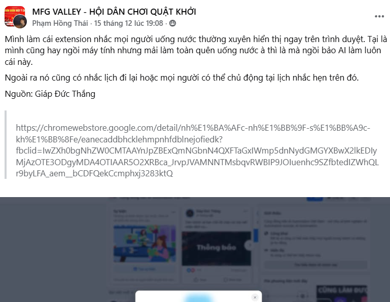 Mình làm cái extension nhắc mọi người uống nước thường xuyên hiển thị ngay trên trình duyệt. Tại là mình cũng hay ngồi máy tính nhưng mải làm toàn quên uống nước à thì là mà ngồi bảo AI làm luôn cái này.