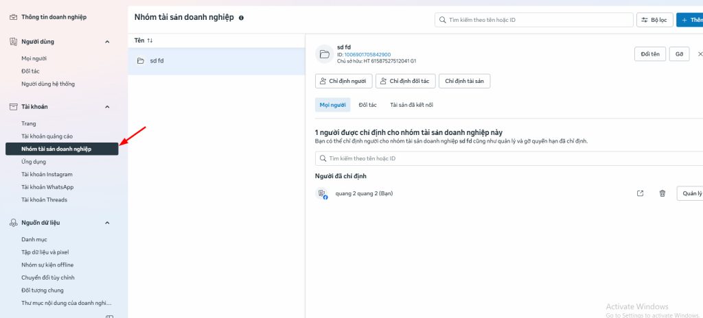 Nhưng anh em không chỉ định cho nó vào tài khoản quảng cáo của bm được . Thì phải tạo nhóm tài sản doanh nghiệp xong mới chỉ định được nhé