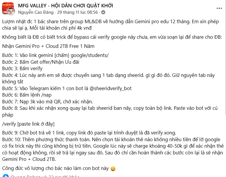 Lượm nhặt đc 1 bác share trên group ML&DB về hướng dẫn Gemini pro edu 12 tháng. Em xin phép chia sẽ lại ạ. Mỗi tài khoản chi phí 4k vnđ
