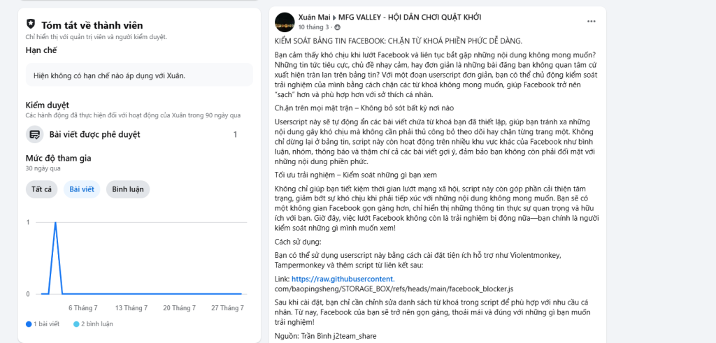 Bạn cảm thấy khó chịu khi lướt Facebook và liên tục bắt gặp những nội dung không mong muốn? Những tin tức tiêu cực, chủ đề nhạy cảm, hay đơn giản là những bài đăng bạn không quan tâm cứ xuất hiện tràn lan trên bảng tin? Với một đoạn userscript đơn giản, bạn có thể chủ động kiểm soát trải nghiệm của mình bằng cách chặn các từ khoá không mong muốn, giúp Facebook trở nên “sạch” hơn và phù hợp hơn với sở thích cá nhân.