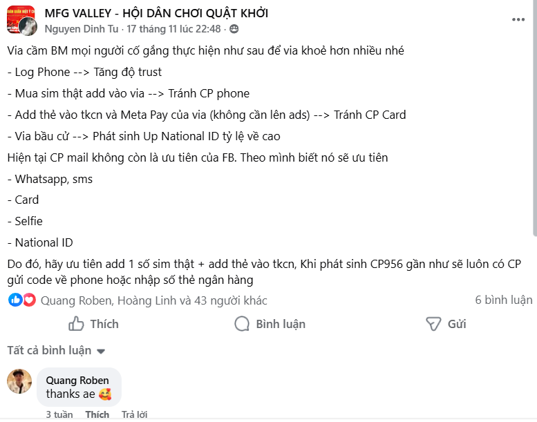 – Add thẻ vào tkcn và Meta Pay của via (không cần lên ads) –> Tránh CP Card