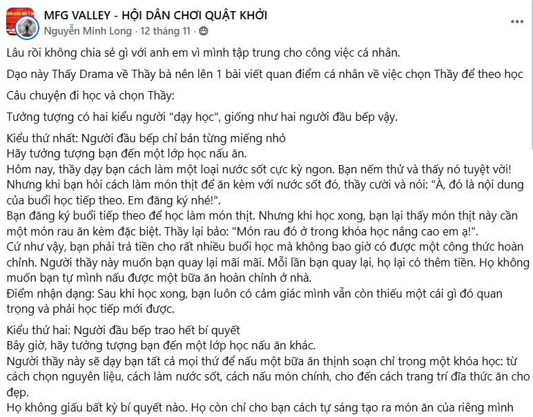 Còn kiểu thầy kia thì giống như người bán hàng. Họ sẽ không bao giờ đưa cho bạn cả chiếc xe, mà hôm nay họ bán cho bạn cái bánh xe, ngày mai bán cái yên, ngày kia bán cái tay lái.