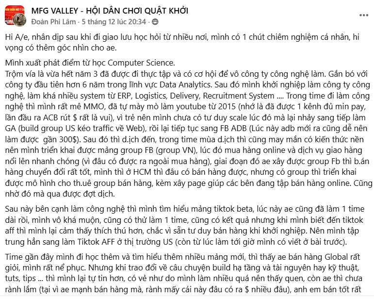 Trộm vía là vừa hết năm 3 đã được đi thực tập và có cơ hội để vô công ty công nghệ làm. Gắn bó với công ty đầu tiên hơn 6 năm trong lĩnh vực Data Analytics. Sau đó mình khởi nghiệp làm công ty công nghệ, làm khá nhiều system từ ERP, Logistics, Delivery, Recruitment System …. Trong time đi làm công nghệ thì mình rất mê MMO, đã tự mày mò làm youtube từ 2015 (nhớ là đã được 1 kênh đủ min pay, lần đầu ra ACB rút $ rất là vui), vì trẻ nên mình chưa có tư duy scale lúc đó mà lại nhảy sang tiếp làm GA (build group US kéo traffic về Web), rồi lại tiếp tục sang FB ADB (Lúc này adb mới ra cũng dễ nên làm được gần 300$). Sau đó thì d.ịch đến, trong time mùa d.ịch thì cũng may mắn có kiến thức nền nên mình triển khai được mảng group FB (group VN), lúc đó mua hàng online và dịch vụ giao hàng nổi lên nhanh chóng (vì đâu có được ra ngoài mua hàng), giai đoạn đó ae xây được group Fb thì b.án hàng chuyển đổi rất tốt, mình thì ở HCM thì đâu có bán hàng được, nhưng có group thì triển khai được mô hình cho th.uê group bán hàng, kèm xây page giúp các bên đang tập bán hàng online. Cũng nhờ đó mà qua được đợt dịch.