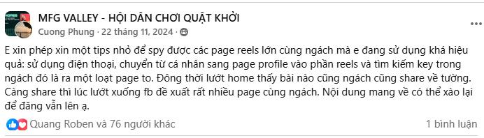 E xin phép xin một tips nhỏ để spy được các page reels lớn cùng ngách mà e đang sử dụng khá hiệu quả: sử dụng điện thoại, chuyển từ cá nhân sang page profile vào phần reels và tìm kiếm key trong ngách đó là ra một loạt page to. Đông thời lướt home thấy bài nào cũng ngách cũng share về tường. Càng share thì lúc lướt xuống fb đề xuất rất nhiều page cùng ngách. Nội dung mang về có thể xào lại để đăng vẫn lên ạ.