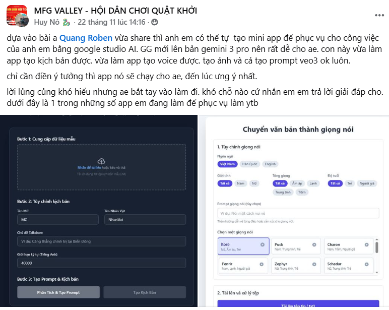 dựa vào bài a Quang Roben vừa share thì anh em có thể tự tạo mini app để phục vụ cho công việc của anh em bằng google studio AI. GG mới lên bản gemini 3 pro nên rất dễ cho ae. con này vừa làm app tạo kịch bản được. vừa làm app tạo voice được. tạo ảnh và cả tạo prompt veo3 ok luôn.