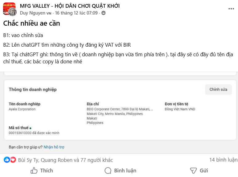 B3: Tại chátGPT ghi: thông tin về ( doanh nghiệp bạn vừa tìm phía trên ). tại đây sẽ có đầy đủ tên địa chỉ thuế, các bác copy là done nhé