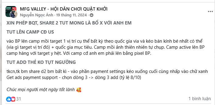 vào BP lên camp mồi target 1 vị trí cụ thể bất kỳ theo quốc gia via và kéo bán kính bé nhất có thể (via gì target vị trí đó) + quốc gia mục tiêu. Camp mồi ảnh thiên nhiên tự chụp. Camp active lên BP camp hàng với target y hệt. Với camp cđ anh em phải lên bằng pixel BP.